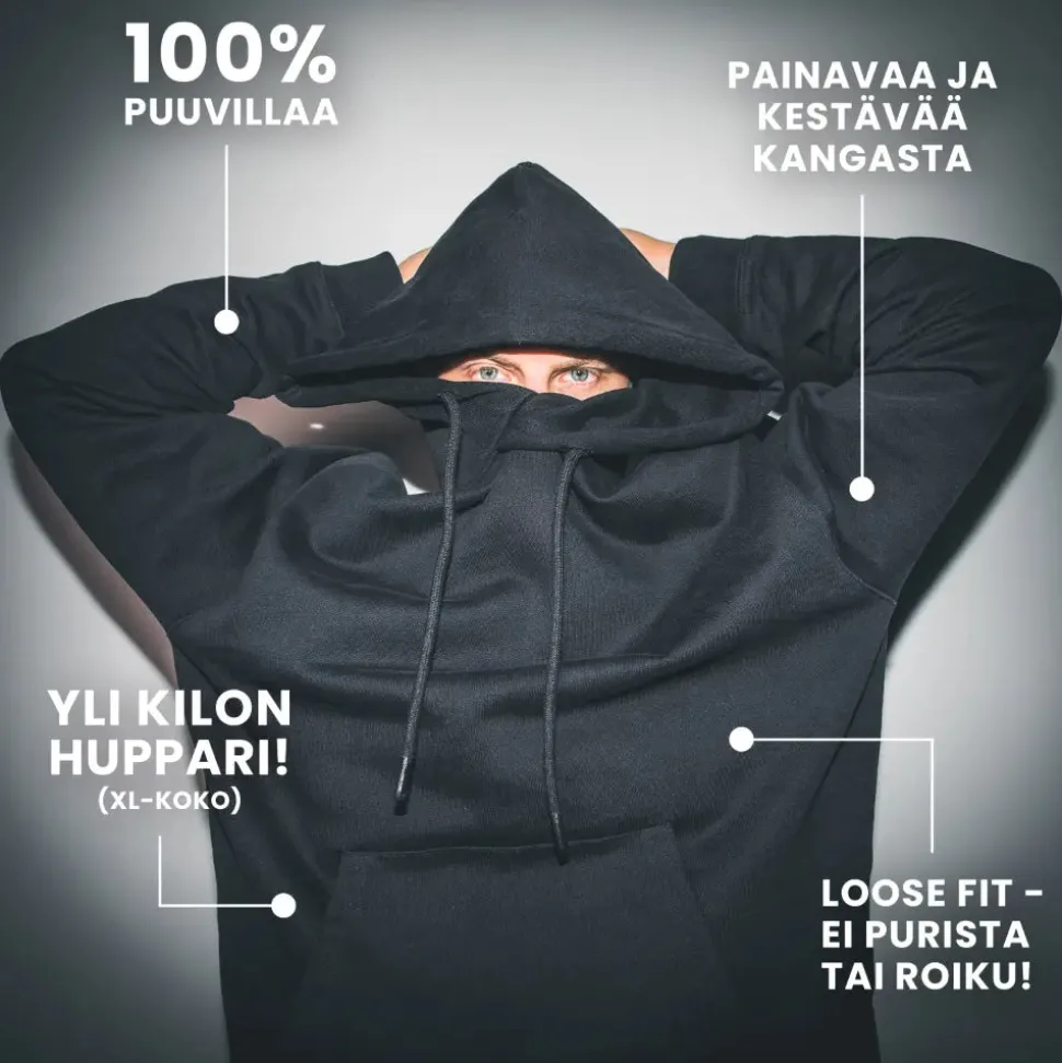 Valitsimme huppariin markkinoiden paksuimman materiaalin: 500-grammaisen puuvillakankaan. Yksi neliömetri tätä tavaraa painaa siis puoli kiloa, ja siksi hupparimme painaa yli kilon (koko XL). Jämäkkää ja kestävää, mutta silti mukavaa päällä.