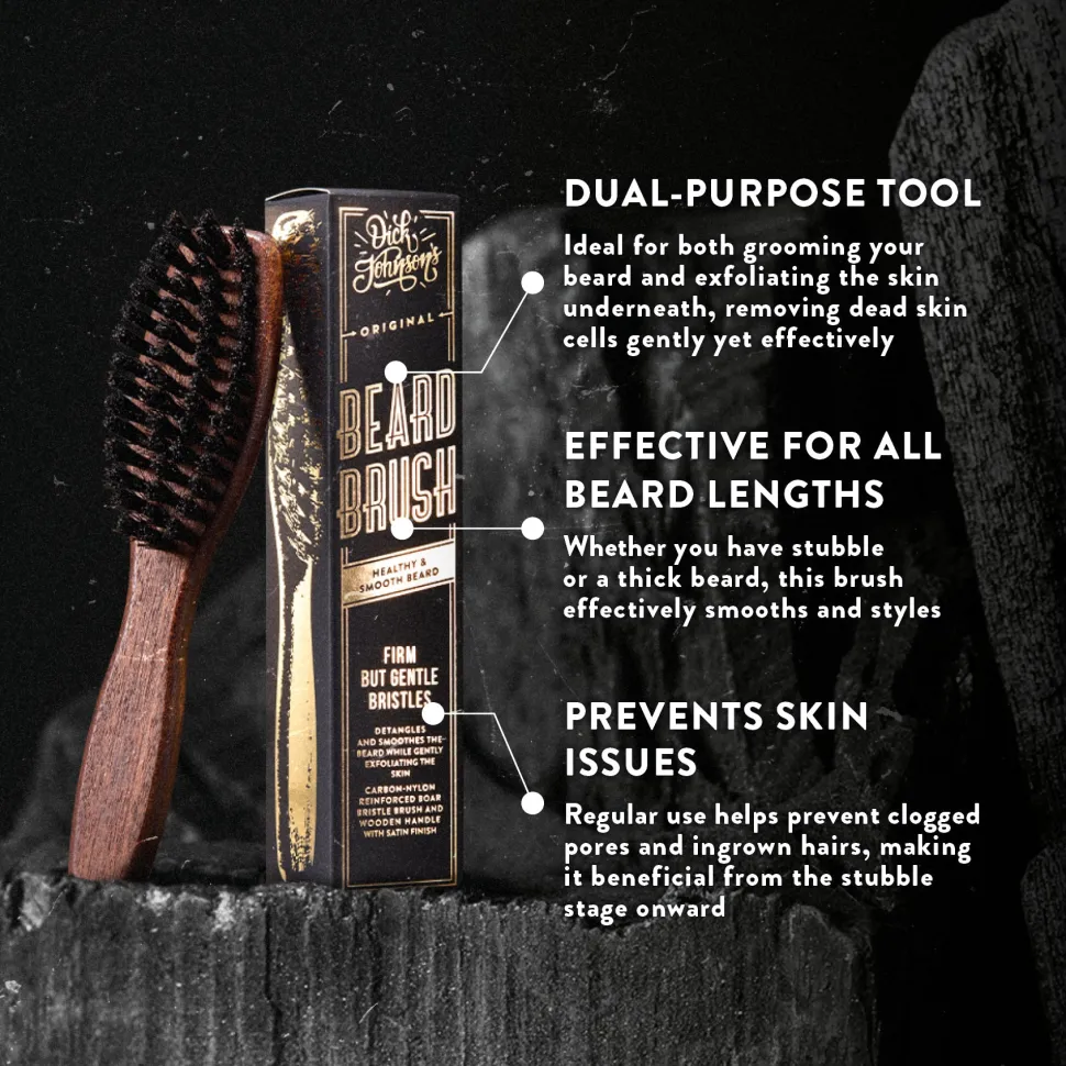 Dick Johnsonin partaharja on valmistettu nailonilla vahvistetuista villisianharjaksista, jotka tarjoavat täydellisen yhdistelmän kestävyyttä ja parranhoitotehoa. Tyylikäs ja kevyt puukahva on viimeistelty tyylikkäällä satiinilakalla.