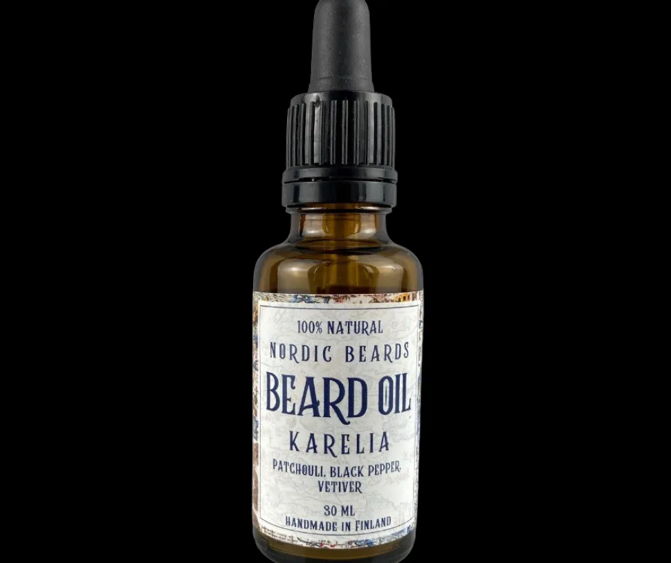 Nordic Beards partaöljy Karelia on partaa ja ihoa hoitava 100% luonnollinen ja vegaaninen partaöljy, joka sisältää runsaasti hoitavia öljyjä. Valmistettu käsityönä Suomessa. Partaöljy tekee parrasta pehmeän ja antaa sille terveen kiillon. Partaöljyn käyttö myös ehkäisee ihon kutinaa ja hilseilyä parran alla. Sopii päivittäiseen käyttöön.