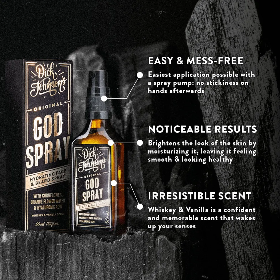 Dick Johnsonin God Spray on helppo aamurutiini yhdessä pullossa. Se sopii täydellisesti miehille, jotka haluavat saada upean ilmeen nopeasti, helposti ja ilman turhaa kikkailua.