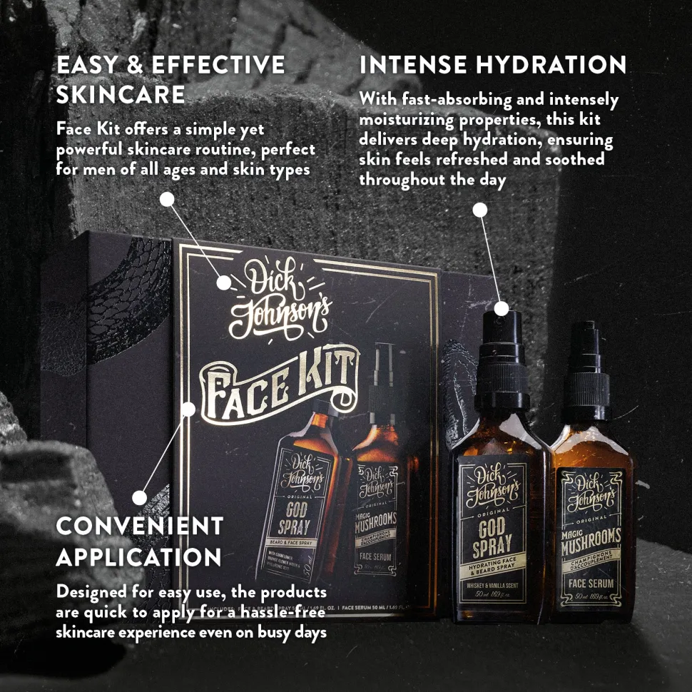 Ihon kosteutusta tukee myös setin sisältämä erittäin helppokäyttöinen God Spray, joka toimii kasvovoiteen kaltaisesti parilla näppärällä suihkauksella! Kosteuttamisen lisäksi kasvospray rauhoittaa ihoa samalla vähentäen turvotusta. Dick Johnsonin Signature Scent -tuoksu yhdistettynä tuotteen laadukkaisiin yrtteihin toimii loistavasti myös stressin lievityksessä.
