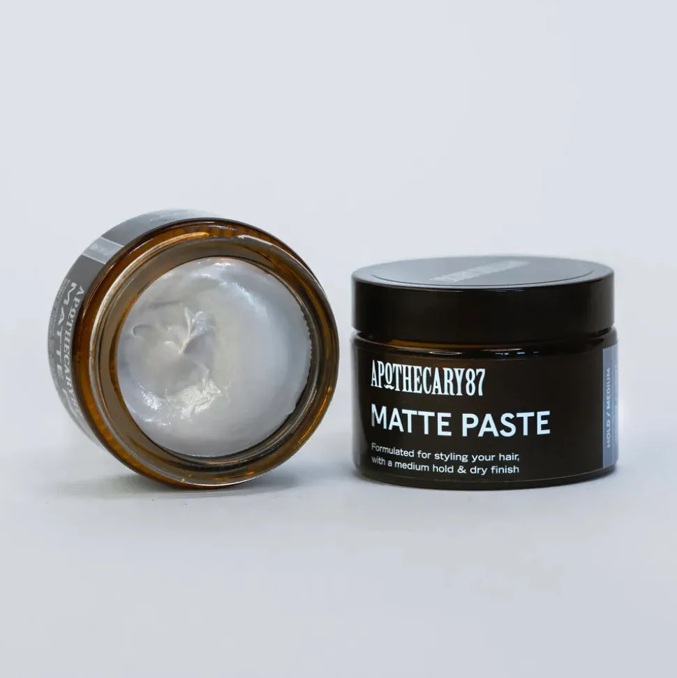Pehmeä, kevyt Paste tahna, jossa on matta viimeistely. Apothecary 87 on suunnitellut hiusvahan kuivumaan jauhemaiseksi tahnaksi, kun sitä työstetään käsiin ja levitetään hiuksiin. Jauhemaisuus antaa hiuksille todellisen mattaisen pinnan, joka jättää joustavan ja muokattavan lopputuloksen. Matt Paste antaa hyvää rakennetta ja hallittua pitoa keskipitkiin tyyleihin.